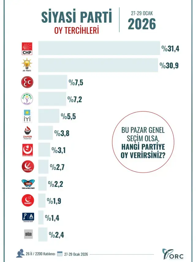 Türkiye’de siyaset gündemi anket sonuçlarıyla yeniden hareketlendi. ORC Araştırma tarafından 27–29 Ocak 2026 tarihleri arasında yapılan ve 26 ili kapsayan son kamuoyu araştırması, seçmenin nabzını tuttu. “Bu pazar genel seçim olsa hangi partiye oy verirsiniz?” sorusuna verilen yanıtlar, özellikle zirve yarışında dengelerin değişebileceğine işaret ediyor.