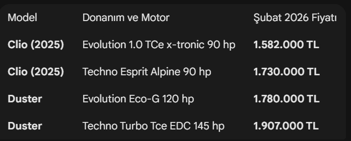 Şubat ayı listeleri yüksek görünse de Renault, belirli modellerde “Şubat’a Özel Finansman” kampanyaları planlıyor. Özellikle stoktaki 2025 model Clio ve Captur modelleri için düşük faizli kredi imkanlarının bayilerde aktif olduğu belirtiliyor.