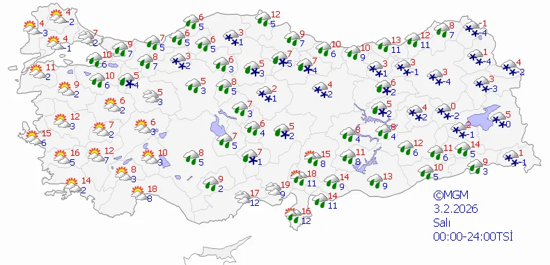 Soğuk hava dalgası etkisini artırırken, gözler yeniden kar tahminlerine çevrildi. Meteoroloji Genel Müdürlüğü (MGM), internet sitesinde yayımladığı 5 günlük hava tahmin raporunda, 3 Şubat 2026 Salı günü Türkiye genelinde 24 il için kar yağışı beklendiğini duyurdu.
